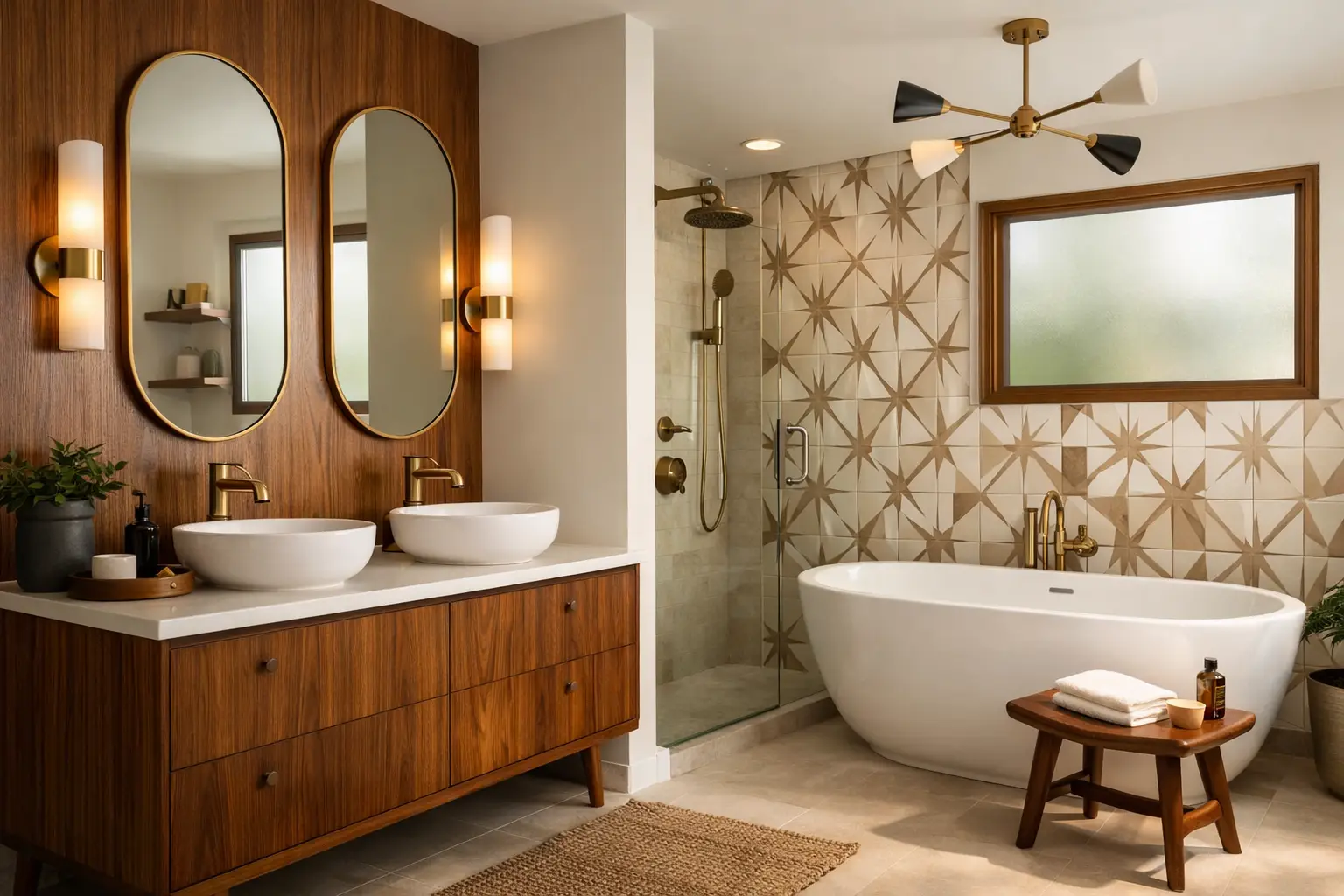 Refine your bathroom design mid century modern style with warm woods, vintage lighting, terrazzo, brass details, and balanced proportions.