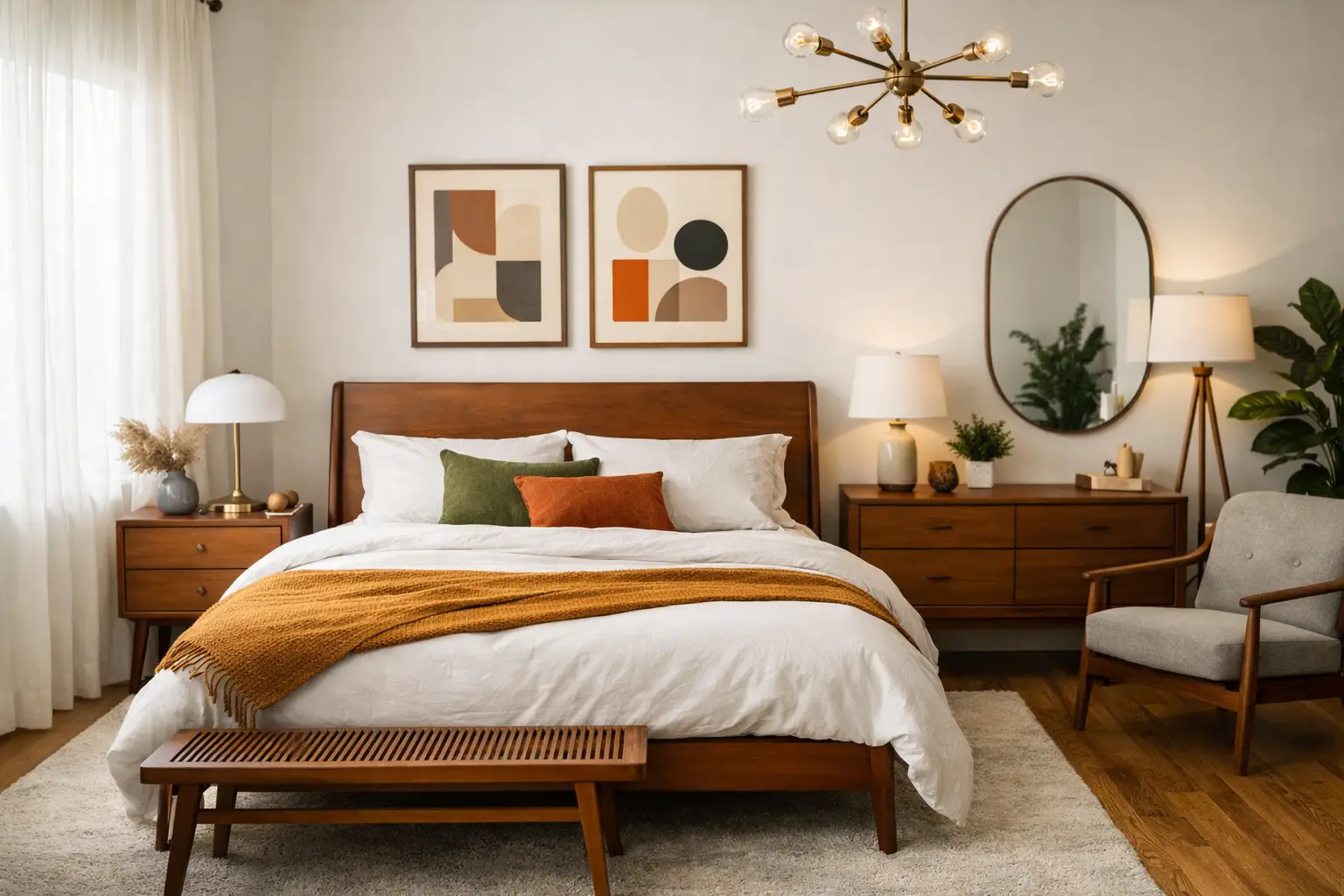 Bedroom design mid century modern favors clean lines, warm woods, sculptural lighting, and curated vintage pieces that give the room depth.